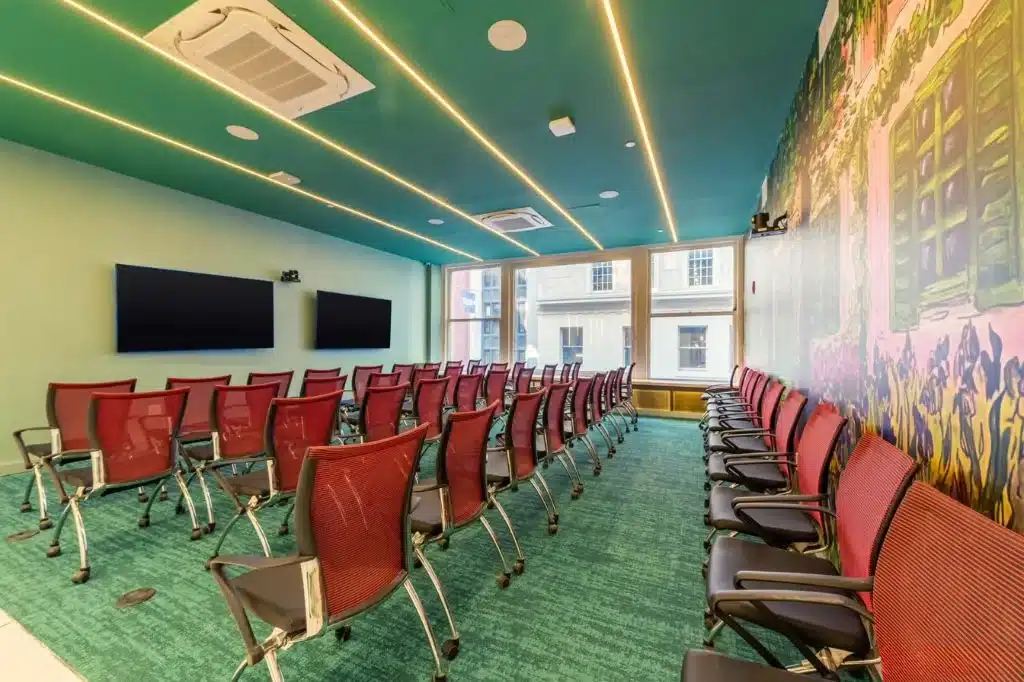 Conference Space NYC is bathed in natural light from floor-to-ceiling windows, the room’s serene aesthetic—themed after the works of Claude Monet. It’s perfect for intimate meetings, strategy sessions, or creative workshops. Featuring dual 75" high-definition displays and advanced audio-visual technology, the room is fully equipped for seamless and impactful presentations.