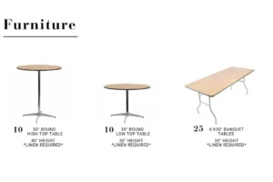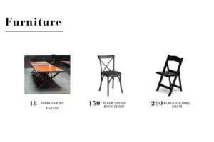 18 Farm Tables — 8’x4’x30″ (rustic wooden tops, often with metal bases for industrial vibe)