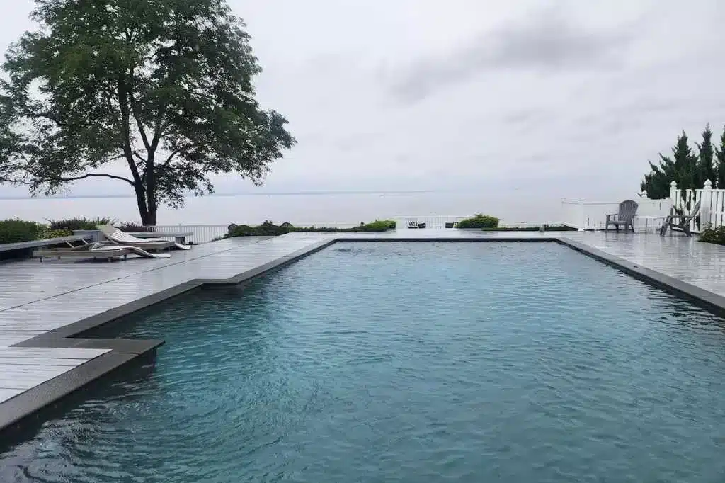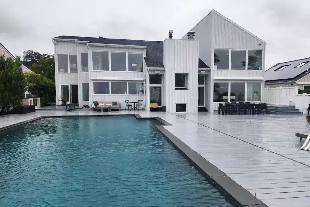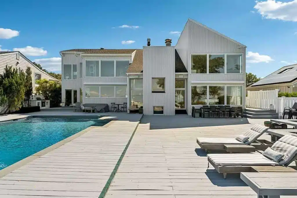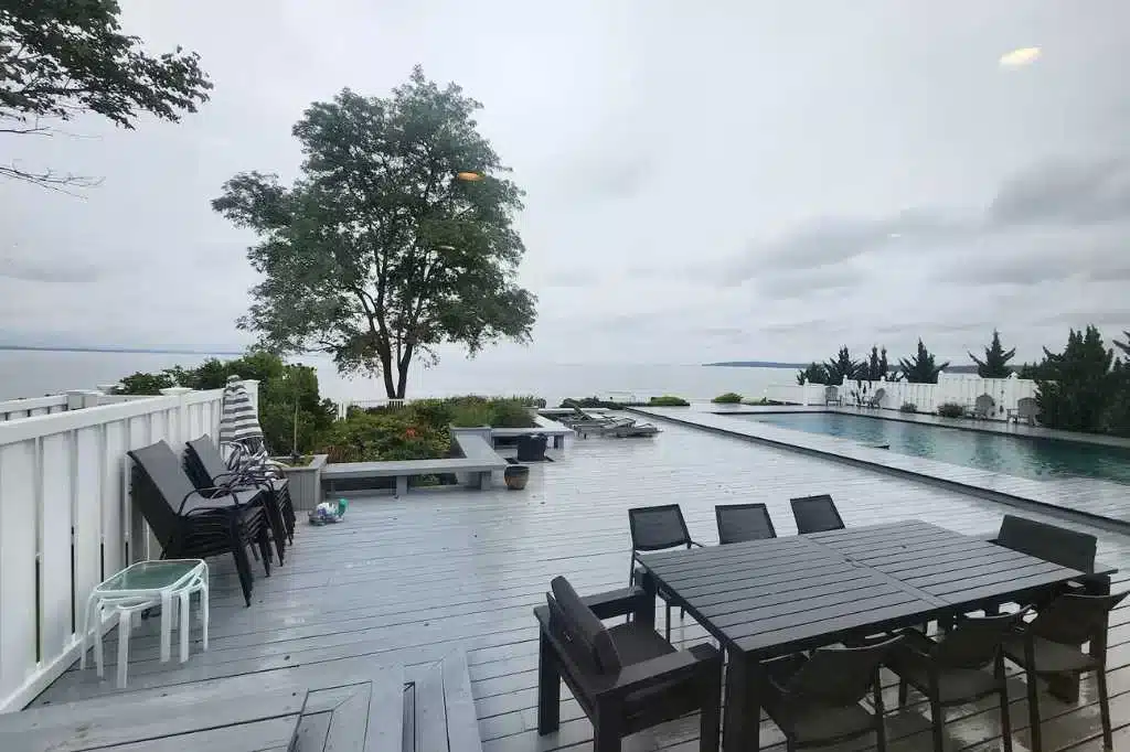 Outside, a wide wooden deck surrounds a pristine pool positioned at the edge of the property, creating the illusion that the water drops straight into the Sound. An additional overlook deck extends toward the shoreline, offering one of the most dramatic vantage points on the property—perfect for filming sunset dinners or waterfront scenes. A private path provides direct access to the beach.