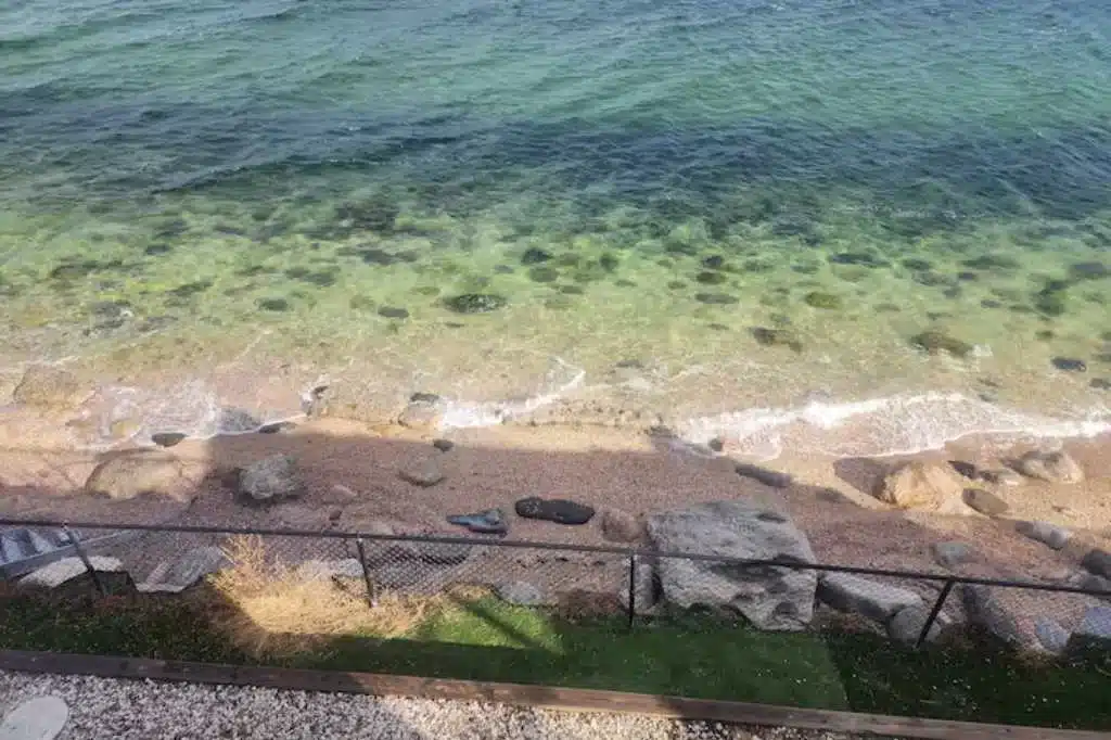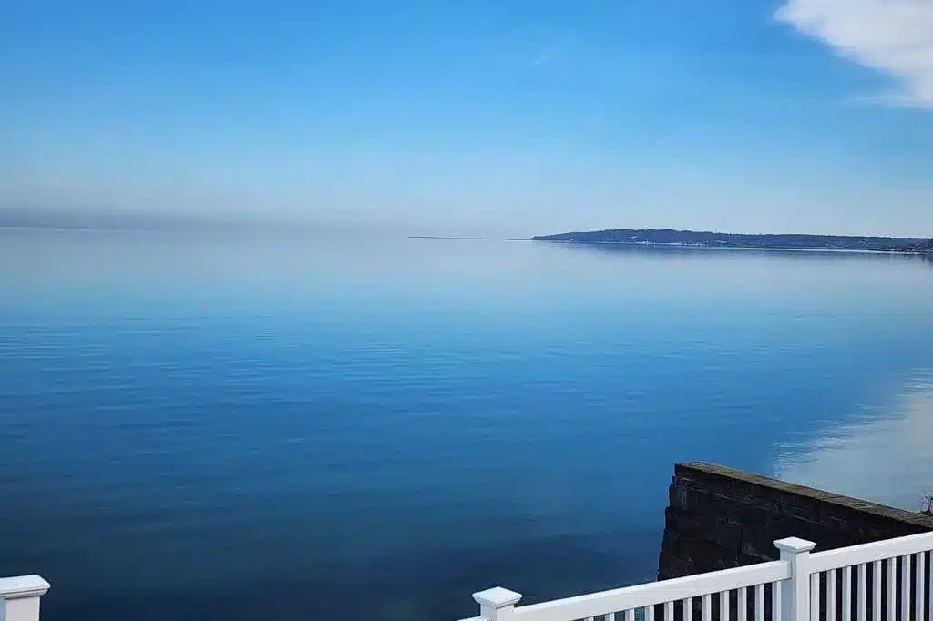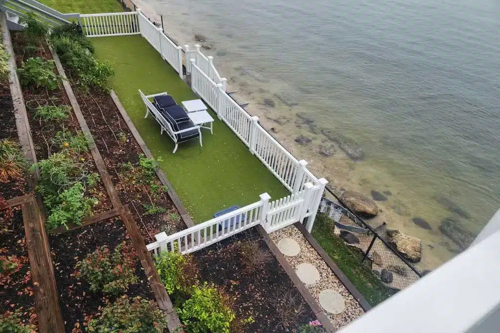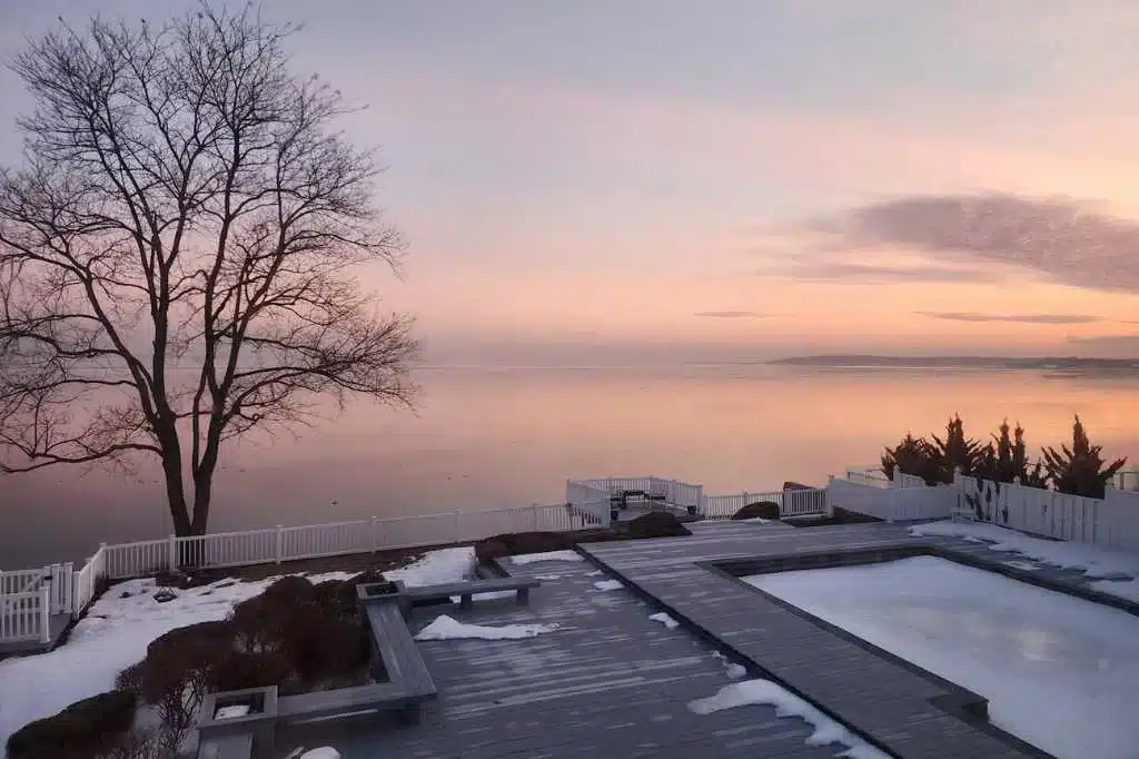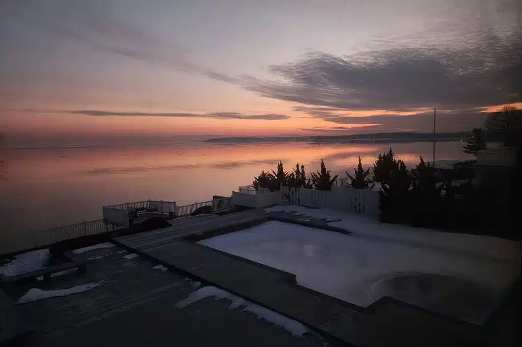 Outside, a wide wooden deck surrounds a pristine pool positioned at the edge of the property, creating the illusion that the water drops straight into the Sound. An additional overlook deck extends toward the shoreline, offering one of the most dramatic vantage points on the property—perfect for filming sunset dinners or waterfront scenes. A private path provides direct access to the beach.