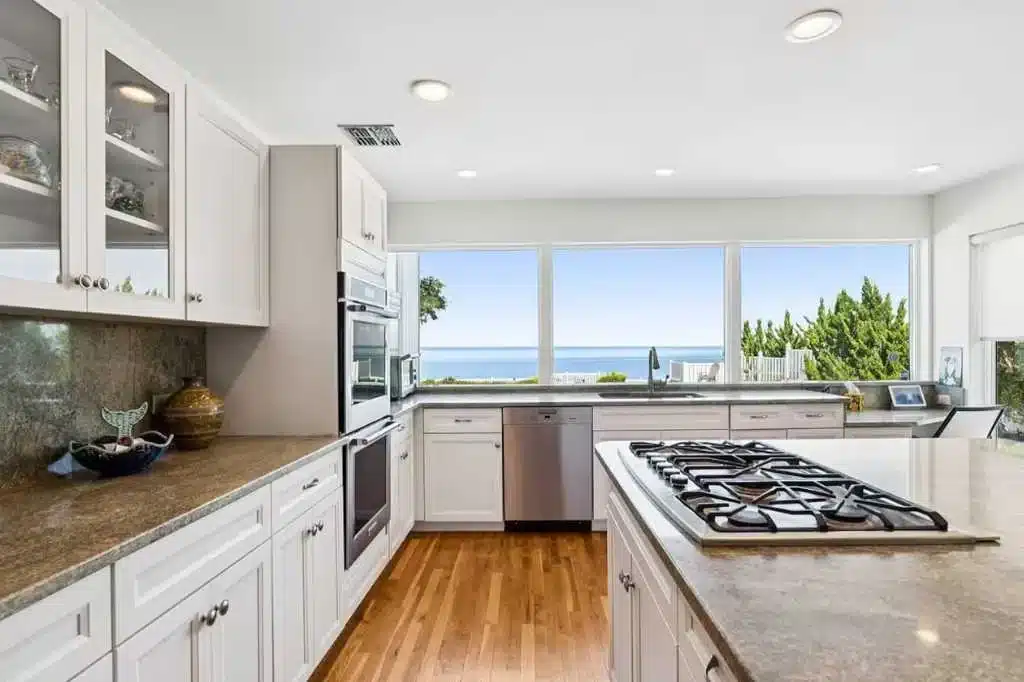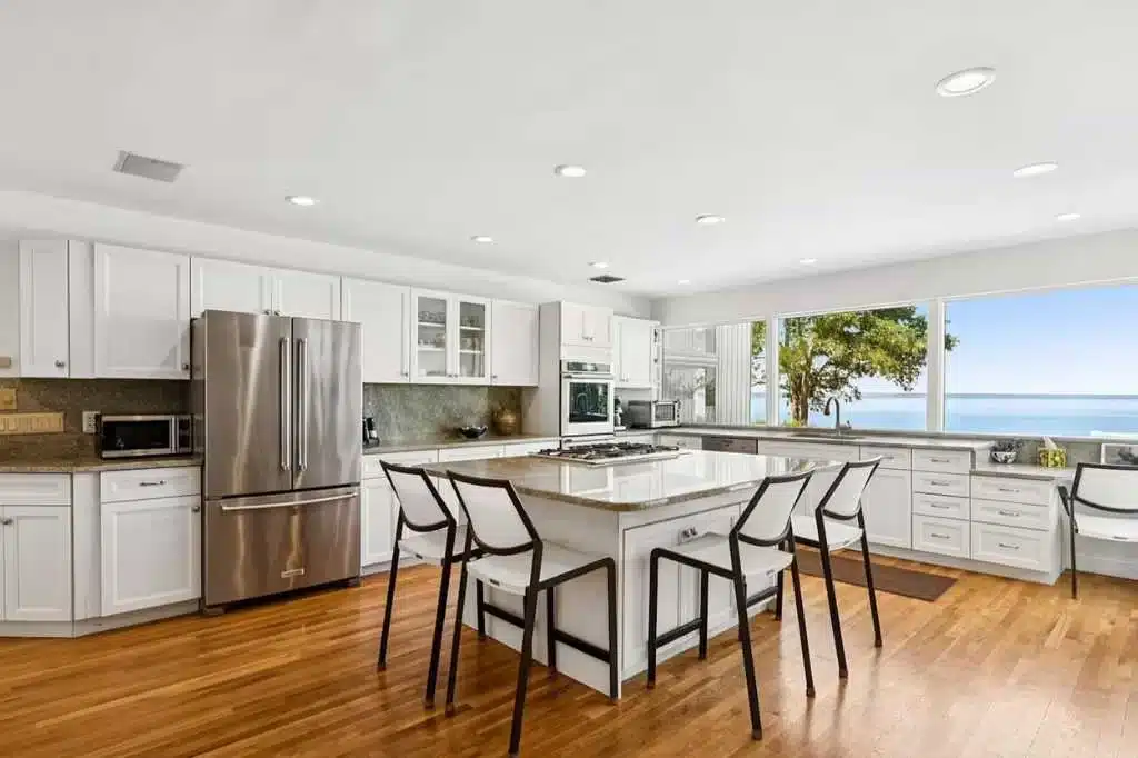 The kitchen features a large social island, perfect for preparing meals while chatting with guests, and watching the sunset.
