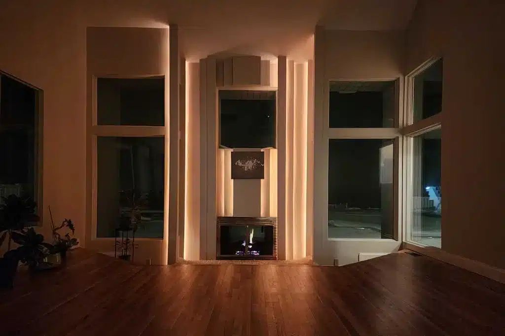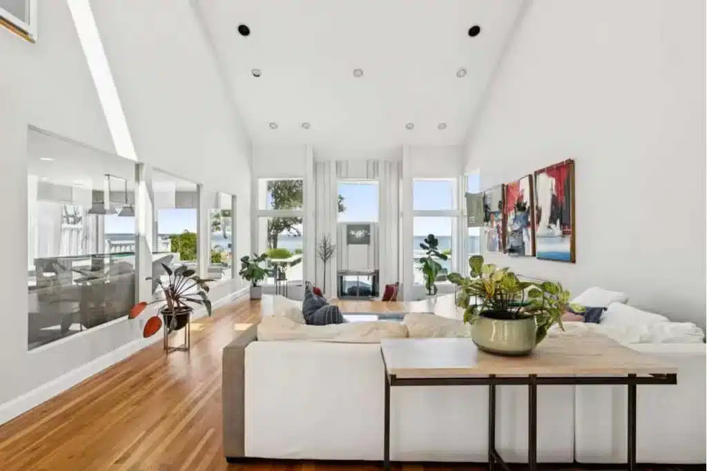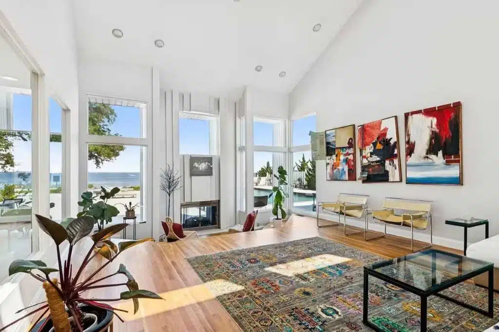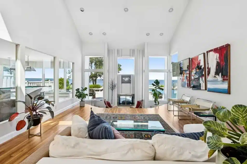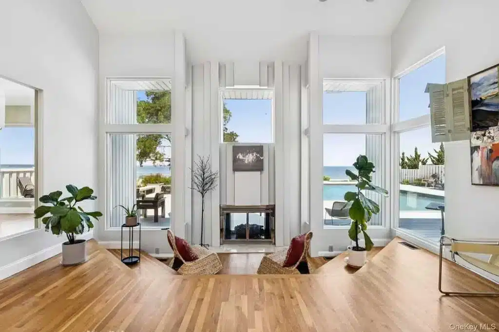 Inside, the living room features soaring vaulted ceilings, floor-to-ceiling windows, and a sunken conversation area centered around the fireplace—an architectural focal point that opens the space while framing the water beyond.