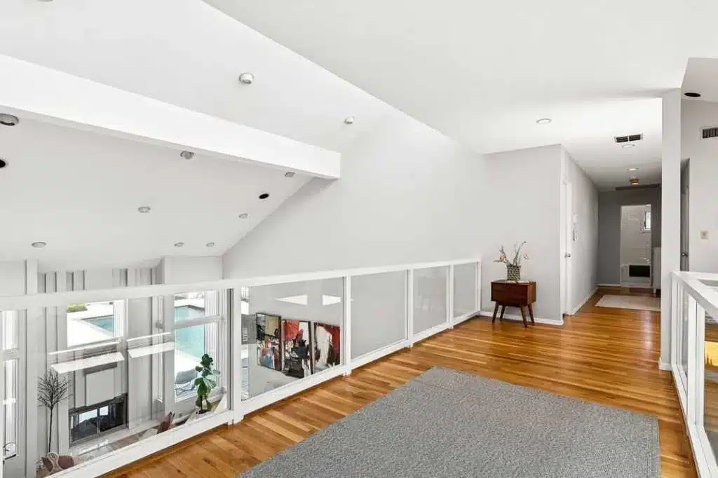 Soaring vaulted ceilings, massive windows and a sunken "conversation pit" by the fireplace.